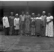 173. EAP054/1/158/173 Reference (shelfmark): EAP054/1/158/173 Title: Recreational photograph [c 1980] Scope & Content: Group round couple standing in front of large building Format of original: 58mm x 59mm plastic negative Collection Area: Endangered Archives Programme Languages: Not applicable Date Range: c 1980 Extent: 1 TIFF image