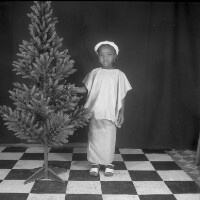 209. EAP054/1/164/209 Reference (shelfmark): EAP054/1/164/209 Title: Recreational photograph [c 1982] Scope & Content: Small girl standing, touching the plastic tree Format of original: 59mm x 59mm plastic negative Collection Area: Endangered Archives Programme Languages: Not applicable Date Range: c 1982 Extent: 1 TIFF image