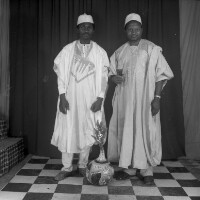 3. EAP054/1/32/3 Reference (shelfmark): EAP054/1/32/3 Title: Recreational photograph [c 1987] Scope & Content: 2 men in Muslim dress standing, decorated gourd in front Format of original: 59mm x 59mm plastic negative Collection Area: Endangered Archives Programme Languages: Not applicable Date Range: c 1987 Extent: 1 TIFF image