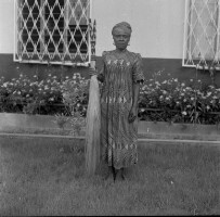 568. EAP054/1/33/568 Reference (shelfmark): EAP054/1/33/568 Title: Recreational photograph [c 1986] Scope & Content: Woman standing with light fly whisk Format of original: 59mm x 59mm plastic negative Collection Area: Endangered Archives Programme Languages: Not applicable Date Range: c 1986 Extent: 1 TIFF image