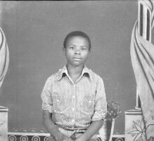 2 young women standing, behind an iron grillwork, one with handbag over right shoulder, right hand on bag and left on grill. Format of original: 59mm x 59mm plastic negative