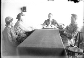 7013. EAP264/1/8/14/86 Reference (shelfmark): EAP264/1/8/14/86 Title: Factory workers in a director’s office, Ulaanbaatar [1940s] Collection Area: Endangered Archives Programme Languages: Not applicable Date Range: 1940s Extent: 1 TIFF image