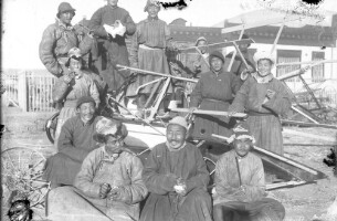 7028. EAP264/1/8/14/101 Reference (shelfmark): EAP264/1/8/14/101 Title: Folks examine an agricultural machinery for hay harvesting, Ulaanbaatar [1940s] Collection Area: Endangered Archives Programme Languages: Not applicable Date Range: 1940s Extent: 1 TIFF image
