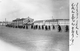 7021. EAP264/1/8/14/94 Reference (shelfmark): EAP264/1/8/14/94 Title: Cyclists commute on the SukhbaTars square, Ulaanbaatar [1930s] Collection Area: Endangered Archives Programme Languages: Not applicable Date Range: 1930s Extent: 1 TIFF image