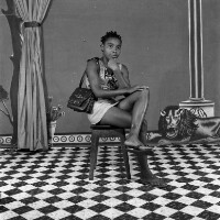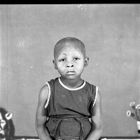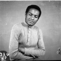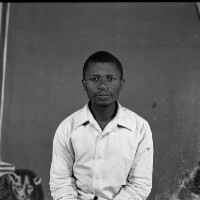 Young man from Bamessingue, in white short-sleeved shirt, left hand on hip, in front of the photographers studio in Mbouda, BPC bakery behind. Format of original: 59mm x 59mm plastic negative