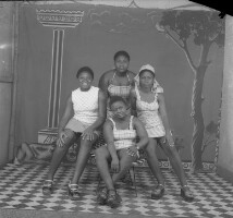 Woman from Babete standing with her children in white on the steps of the Catholic Mission church in Mbouda. Format of original: 59mm x 59mm plastic negative