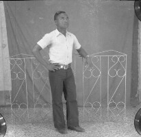 104. EAP054/1/81/214 Reference (shelfmark): EAP054/1/81/214 Title: Recreational photograph [c 1977] Scope & Content: Man standing, leaning on iron grillwork, hand on hip Format of original: 58mm x 59mm plastic negative Collection Area: Endangered Archives Programme Languages: Not applicable Date Range: c 1977 Extent: 1 TIFF image