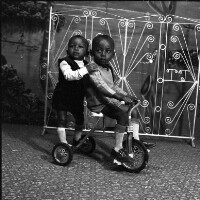 111. EAP054/1/81/239 Reference (shelfmark): EAP054/1/81/239 Title: Recreational photograph [c 1977] Scope & Content: 2 children, one standing behind another on a tricycle in front of iron grillwork Format of original: 59mm x 59mm plastic negative Collection Area: Endangered Archives Programme Languages: Not applicable Date Range: c 1977 Extent: 1 TIFF image