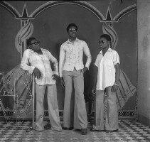 119. EAP054/1/81/277 Reference (shelfmark): EAP054/1/81/277 Title: Recreational photograph [c 1977] Scope & Content: Standing, 3 young men, one leaning on iron grillwork Format of original: 56mm x 59mm plastic negative Collection Area: Endangered Archives Programme Languages: Not applicable Date Range: c 1977 Extent: 1 TIFF image