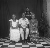 158. EAP054/1/164/150 Reference (shelfmark): EAP054/1/164/150 Title: Recreational photograph [c 1982] Scope & Content: Group of 4 people, a man standing behind, man sitting between 2 women Format of original: 57mm x 59mm plastic negative Collection Area: Endangered Archives Programme Languages: Not applicable Date Range: c 1982 Extent: 1 TIFF image