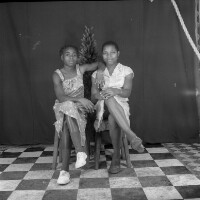 155. EAP054/1/164/141 Reference (shelfmark): EAP054/1/164/141 Title: Recreational photograph [c 1982] Scope & Content: 2 young women, one standing with hand on shoulder of the other sitting, with crossed legs. Format of original: 59mm x 59mm plastic negative Collection Area: Endangered Archives Programme Languages: Not applicable Date Range: c 1982 Extent: 1 TIFF image