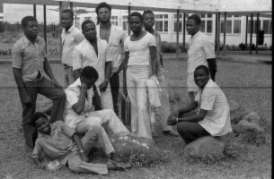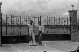 189. EAP054/1/153/257 Reference (shelfmark): EAP054/1/153/257 Title: Recreational photograph [c 1976] Scope & Content: 2 young men in front of gates of the Federal Bilingual Grammar School Format of original: 42mm x 64mm plastic negative Collection Area: Endangered Archives Programme Languages: Not applicable Date Range: c 1976 Extent: 1 TIFF image