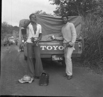 182. EAP054/1/153/86 Reference (shelfmark): EAP054/1/153/86 Title: Recreational photograph [c 1976] Scope & Content: 2 men standing in front of pickup truck Format of original: 56mm x 59mm plastic negative Collection Area: Endangered Archives Programme Languages: Not applicable Date Range: c 1976 Extent: 1 TIFF image