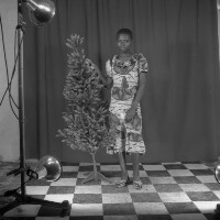 Young woman from Bafounda, standing, in white, left hand on iron grillwork, plastic tree on her right. Format of original: 59mm x 59mm plastic negative