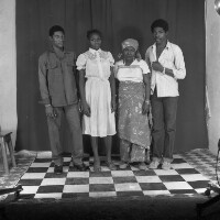 1 May, employees of the Boulangerie Patisserie Camerounaise (BPC) in front of their shop, some standing, some crouching. Format of original: 59mm x 59mm plastic negative