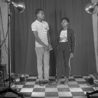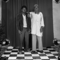 Man from Bamessingue in white "boubou" shirt and traditional hat, right elbow on his son"s shoulder, both standing, son in dark blouson jacket. Format of original: 59mm x 59mm plastic negative