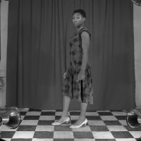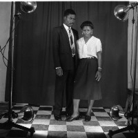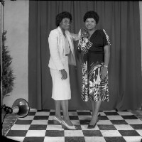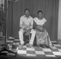 Couple from Batcham standing, man in dark suit, woman in dark skirt and short-sleeved white blouse, dark shoes. Format of original: 59mm x 59mm plastic negative