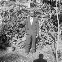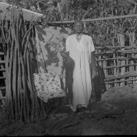 Old man from Batcham standing, in white "gandoura" robe and traditional Bamileke hat, horse tail fly whisk in right hand, in front of the bamboo fence of his compound. Format of original: 59mm x 59mm plastic negative
