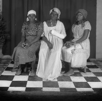 3 women from Balatchi sitting, scarves on heads, the one in the middle in white with bandaged left arm in sling; the one on the left holding a white bag. Format of original: 59mm x 59mm plastic negative