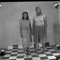 2 women from Batang, friends, standing, holding hands, one with scarf on head, the other with simple hairstyle, full length dress for one, skirt and top for the other. Format of original: 59mm x 59mm plastic negative
