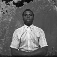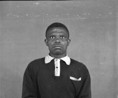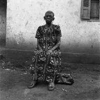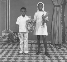Wedding: bride and groom from Mbouda with their families in front of the Catholic Mission church in Mbouda, groom in dark jacket and bride in white dress. Format of original: 59mm x 59mm plastic negative