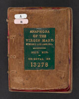- An Ethiopian manuscript containing: ff. 3r- 39v. The Anaphora of the Virgin Mary by Cyriacus, Bishop of Behnesa. Title: አኰቴተ ቍርባን ዘእግዝእትነ ማርያም ዘደረሰ አባ ሕርያቆስ ኤጲስ ቆጶስ ዘሀገረ ብሕንሳ በመንፈስ ቅዱስ በእንተ እግዝእትነ ማርያም ወላዲተ አምላክ. ff. 39v-88v. Amharic version of the መጸሐፈ ሥርዓት, Mäṣhafä S’er’at. ff. 88v-91v. Thr...