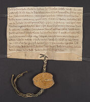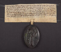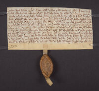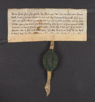 - Grant by Petronilla, daughter of Alfred the Little, to William Cocaine, for his homage and service, of 2 acres of land in the manor (halimoto) of Berkhamsted. Endorsed: in a 13th-century hand, ‘Halimoto’. Affixed with a fine seal of Petronilla, lozenge, green, with a full-length image of a wom...