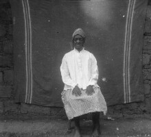 194. EAP054/1/138/194 Reference (shelfmark): EAP054/1/138/194 Title: Recreational photograph [c 1981-1982] Scope & Content: Old person from Bameguyam sitting on a stool, in white 'gandoura' gown, barefoot. Format of original: 54mm x 59mm plastic negative Collection Area: Endangered Archives Programme Languages: Not applicable Date Range: 1981-1982 Extent: 1 TIFF image