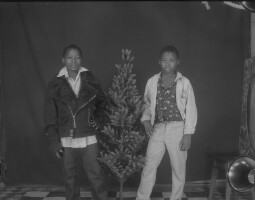 471. EAP054/1/163/471 Reference (shelfmark): EAP054/1/163/471 Title: Recreational photograph [c 1983] Scope & Content: 2 young men standing either side of a plastic tree Format of original: 47mm x 59mm plastic negative Collection Area: Endangered Archives Programme Languages: Not applicable Date Range: c 1983 Extent: 1 TIFF image