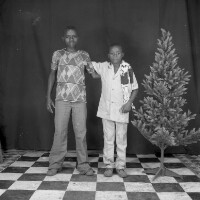 202. EAP054/1/164/202 Reference (shelfmark): EAP054/1/164/202 Title: Recreational photograph [c 1982] Scope & Content: 2 boys standing by plastic tree, arms round each others shoulders Format of original: 59mm x 59mm plastic negative Collection Area: Endangered Archives Programme Languages: Not applicable Date Range: c 1982 Extent: 1 TIFF image