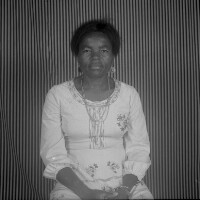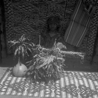23. EAP054/1/23/23 Reference (shelfmark): EAP054/1/23/23 Title: Recreational photograph [c 1988] Scope & Content: Woman sitting with beaded staff holding a piece of peace plant in each hand, by gourd with peace plant; traditional cloth behind Format of original: 59mm x 59mm plastic negative Collection Area: Endangered Archives Programme Languages: Not applicable Date Range: c 1988 Extent: 1 TIFF image