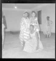 A couple in the foreground of a party: a young woman wearing a white dress, a bracelet, a cap, earrings, and white shoes with a young man wearing a white shirt, white pants, and black shoes, with nine young men and woman standing and dancing and sitting b