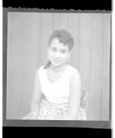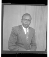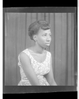 A man wearing a shirt and pants sitting in profile next to a woman wearing a dress, pagne, head wrap, and necklace holding a baby on her lap in the studio.