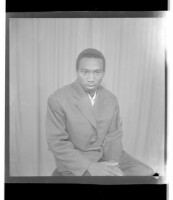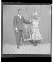 A man wearing a suit standing in profile holding the shoulder of a woman wearing a dress and head wrap standing face-forward with a child in between them in the studio.