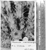 748. EAP923/1/1/1/745 Reference (shelfmark): EAP923/1/1/1/745 Title: Huernia sp. aff. macrocarpa Scope & Content: Genus: Huernia, Taxonomic classification: Apocynaceae. Author(s)/Creator(s): P.J.Greenway. Scribe(s): Jane Chilande. Collection Area: Endangered Archives Programme Languages: Not applicable Date Range: 1910-1940 Extent: 1 tiff image, 2.9 MB
