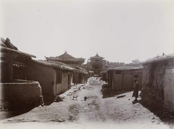 Genre: Architectural Photography View looking across the courtyard towards the temple, from the quarters occupied by Stein during his stay at Hung-shui. PUBLISHED: 'Innermost Asia', vol. 1, fig. 263: 'Temple court outside Hung-shui.' (I.A. Map 46, B4). Subjects = archaeological expeditions; ...