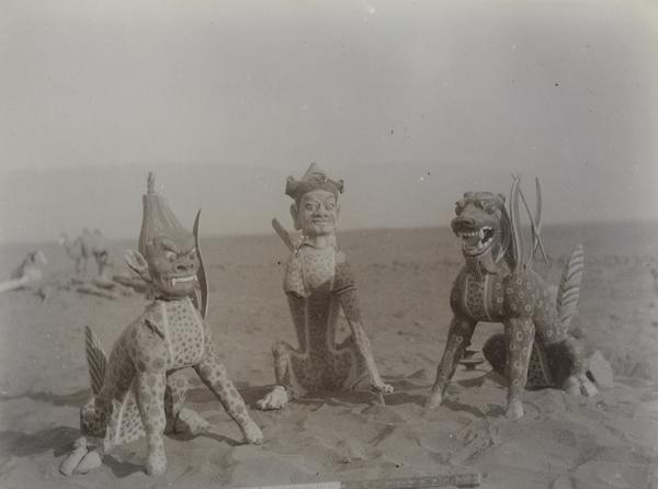 Group of artefacts exhumed from grave and laid out on the ground. PUBLISHED: 'Innermost Asia', vol. 2, fig. 320: 'Jars and bowls in wood or pottery, also food tray, from funerary deposit of Ast. i. 4, Astana Cemetery.' (I.A. Map 28, C3). Subjects = archaeological expeditions; archaeological ...