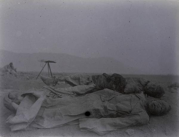 General view of two bodies. PUBLISHED: 'Innermost Asia', vol. 2, fig. 324: 'Mummified corpses of man and woman from seventh century tomb, Ast. ix. 1, Astana Cemetery.' (I.A. Map 28, C3). Subjects = archaeological expeditions; archaeological sites; archaeology; burial sites; exploration; huma...