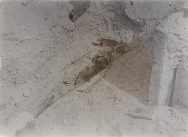Yardangs [wind-eroded terraces] like ruins further north on edge of peneplain above L.S., seen from south-west. [L.S. site, Lop Desert, south-east of Yardang-bulak.] Photographer: Stein, Marc Aurel