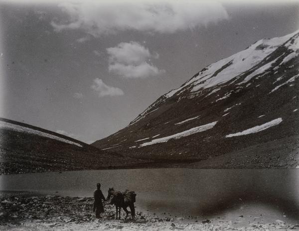 Genre: Landscape Photography View along the shore of the fiord, with path in foreground. Subjects = archaeological expeditions; archaeology; exploration; Stein Collection Location = Tajikistan; Yerkh Fiord