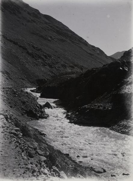 Genre: Landscape Photography Photographed near the junction of the Pamir and Ab-i-Panja rivers. Subjects = archaeological expeditions; archaeology; exploration; Stein Collection Location = Langar-kisht; Tajikistan