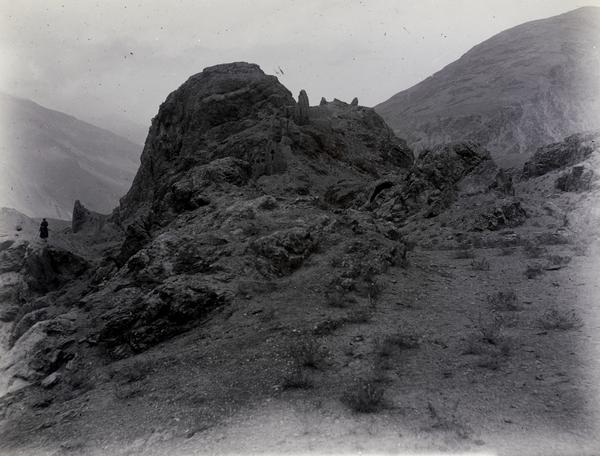Genre: Architectural Photography Right-hand section of two-part panoramic view, continued from print 900. Subjects = archaeological expeditions; archaeological sites; archaeology; exploration; forts; panoramas; Stein Collection Location = Namadgut; Tajikistan