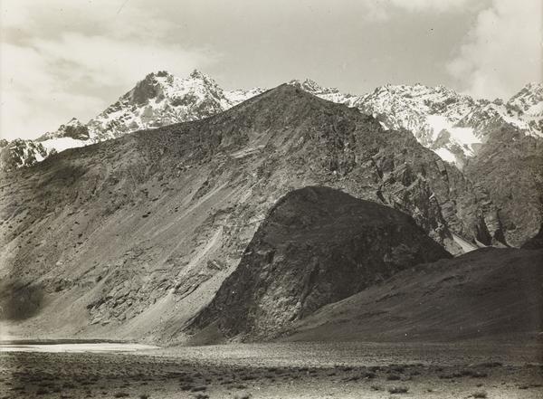 Genre: Landscape Photography View towards mountains, with a flock of sheep grazing near an akoi or felt tent in the foreground. (I.A. Map 3, B2). Subjects = archaeological expeditions; mountain scenery; Stein Collection; tents Location = Hunza; India/Pakistan disputed territory; Kashmir; Mi...