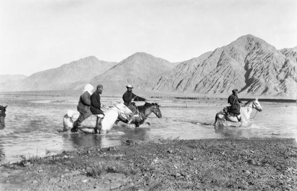 3. Neg 1083/44(66) Reference (shelfmark): Neg 1083/44(66) Title: Horsemen crossing a river (possibly Kirghiz in Chinese militia in Alai Mountains). Photographer: Bailey, Frederick Marshman Scope & Content: Genre: Landscape Photography Collection Area: Visual Arts Languages: Not applicable Date Range: May 1918-Jul 1918 Extent: 1 item