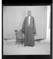 2773. EAP449/2/5/772 Reference (shelfmark): EAP449/2/5/772 Title: A man standing in the studio next to a chair wearing a black boubou Collection Area: Endangered Archives Programme Languages: Not applicable Date Range: 2nd half od the 20th century Extent: 1 TIFF image
