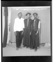 2809. EAP449/2/5/808 Reference (shelfmark): EAP449/2/5/808 Title: Three men standing in the studio, two wearing black boubous, one wearing a white shirt and black pants, all holding cigarettes in their mouths Collection Area: Endangered Archives Programme Languages: Not applicable Date Range: 2nd half od the 20th century Extent: 1 TIFF image