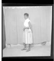 2854. EAP449/2/5/853 Reference (shelfmark): EAP449/2/5/853 Title: A woman standing in the studio wearing a white blouse and a striped skirt Collection Area: Endangered Archives Programme Languages: Not applicable Date Range: 2nd half od the 20th century Extent: 1 TIFF image