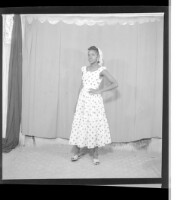 2855. EAP449/2/5/854 Reference (shelfmark): EAP449/2/5/854 Title: A woman standing in the studio with one hand on her hip and wearing a white dress Collection Area: Endangered Archives Programme Languages: Not applicable Date Range: 2nd half od the 20th century Extent: 1 TIFF image