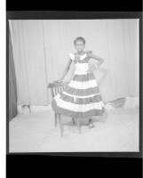 2881. EAP449/2/5/880 Reference (shelfmark): EAP449/2/5/880 Title: A young woman standing in the studio with one foot on a chair wearing a black and white dress Collection Area: Endangered Archives Programme Languages: Not applicable Date Range: 2nd half od the 20th century Extent: 1 TIFF image