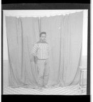 2891. EAP449/2/5/890 Reference (shelfmark): EAP449/2/5/890 Title: A man standing in the studio wearing a striped shirt and glasses Collection Area: Endangered Archives Programme Languages: Not applicable Date Range: 2nd half od the 20th century Extent: 1 TIFF image